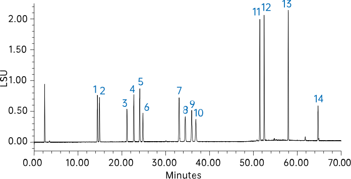 Alphasil Xaqua C18牛黃專用柱在膽酸類化合物分離應用中,展現出可靠的分離性能,14種膽酸類化合物均呈現清晰的色譜峰和良好的分離度,為相關分析工作提供了穩定的技術支持。