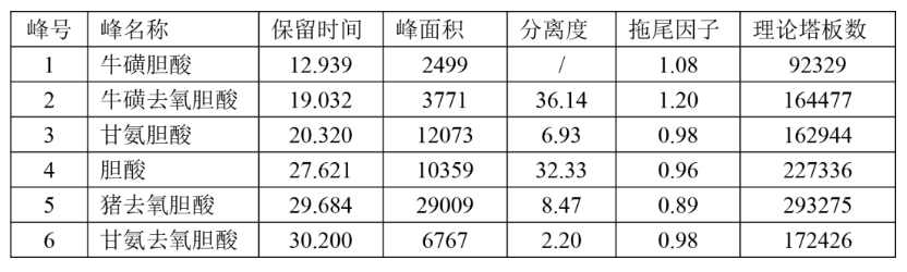 · 牛磺膽酸與牛磺豬去氧膽酸的分離度大于2.0,符合要求;