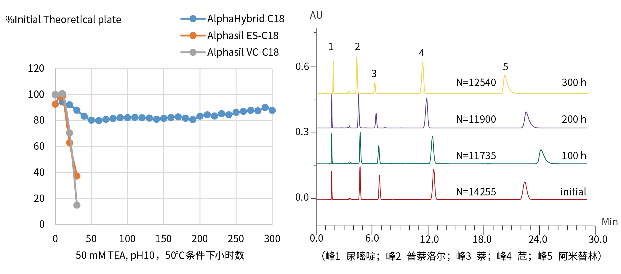 對AlphaHybrid C18耐堿性進行考察,AlphaHybrid C18在50 mM的三乙胺(pH=10)、柱溫50℃的條件下共經(jīng)過300 h,柱效依然保持在80%以上。