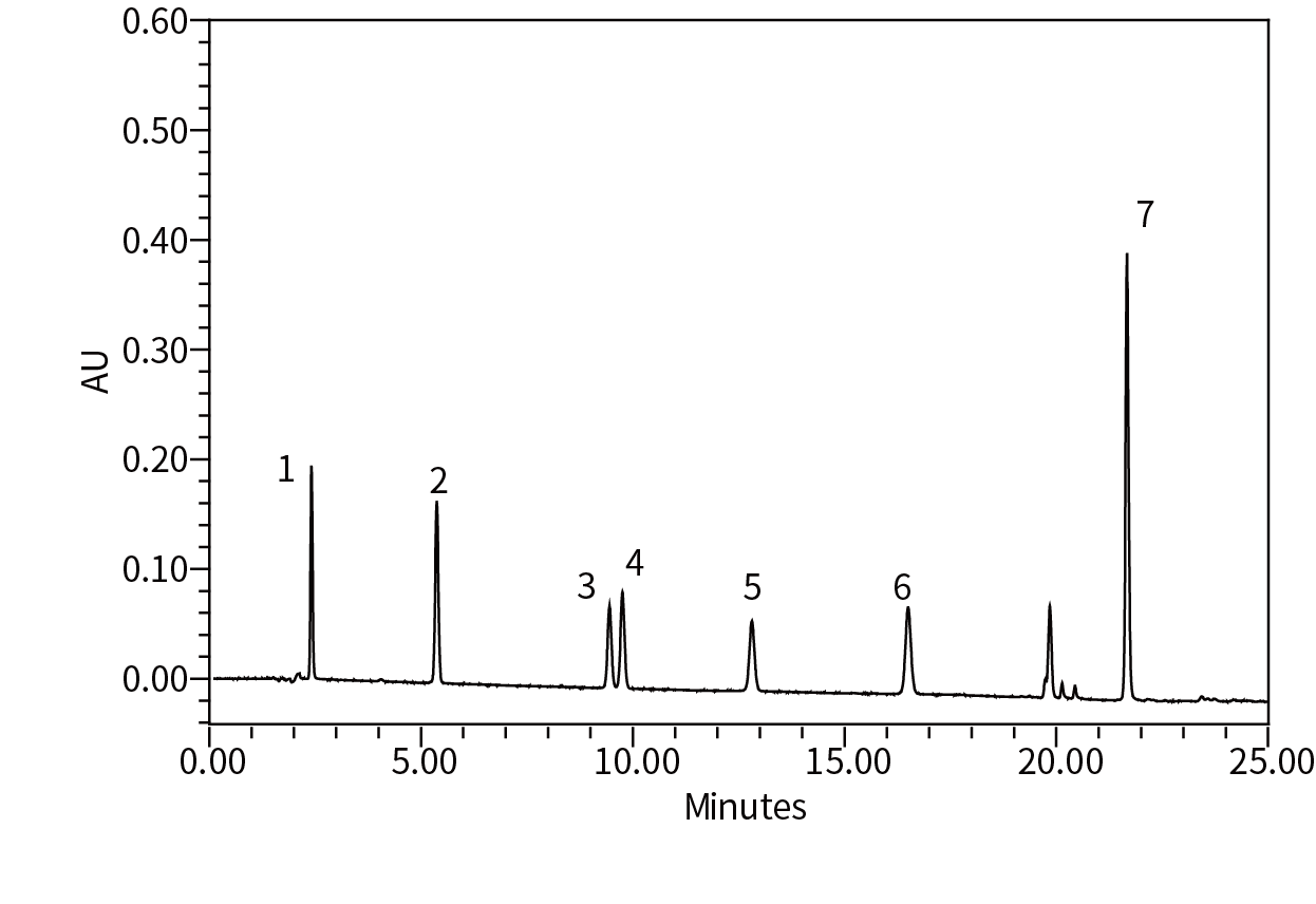 采用AlphaHybrid C18,4.6×150 mm,5 μm色譜柱,對包括索他洛爾、阿替洛爾、拉貝洛爾、吲哚洛爾、美托洛爾、比索洛爾、普萘洛爾在內(nèi)的7種β受體阻斷劑進行分離測試,實現(xiàn)了良好分離。