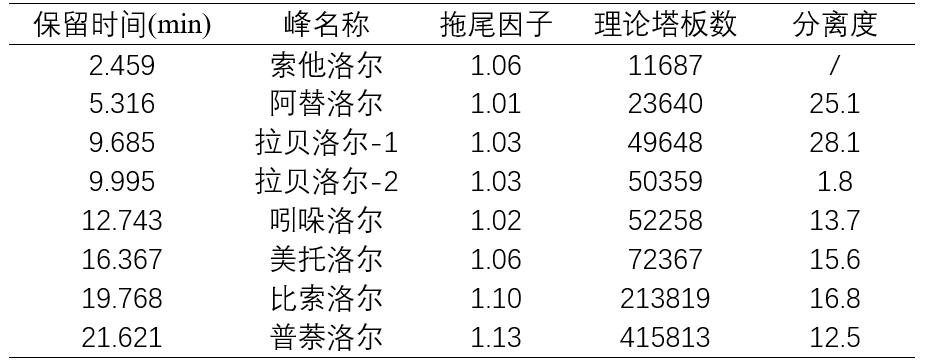 峰1_索他洛爾;峰2_阿替洛爾;峰3_拉貝洛爾(非對映異構(gòu)對);峰4_吲哚洛爾;峰5_美托洛爾;峰6_比索洛爾;峰7_普萘洛爾;)