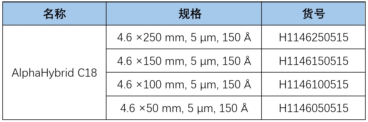華譜科儀研發(fā)團隊以最新研發(fā)的雜化顆粒為載體,結(jié)合特有的鍵合技術和表面修飾,隆重推出AlphaHybrid C18產(chǎn)品。該產(chǎn)品將pH耐受范圍拓寬至12,突破了反相色譜柱在高pH條件下的應用限制,為方法開發(fā)、分析檢測帶來新的選擇!