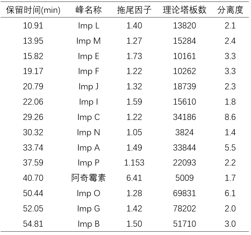 本實驗參照歐洲藥典(EP)方法,采用 AlphaHybrid C18, 4.6×250 mm, 5 μm色譜柱對阿奇霉素有關物質(zhì)項下系統(tǒng)適用性及峰鑒別溶液進行分離,實現(xiàn)阿奇霉素和13種雜質(zhì)的良好分離。