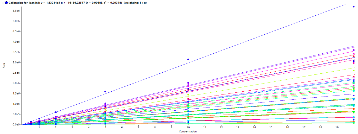 以固相萃取法方式二(HLB法)處理后的甘草為空白基質,配制一系列標準曲線。42種農殘化合物在濃度1/2 LOQ-20 LOQ范圍內線性良好,R2均大于0.99。